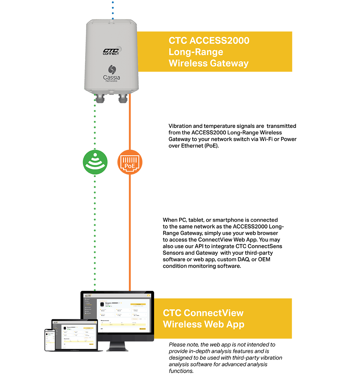 CTC Connect is a line of wireless machine condition monitoring hardware for dynamic vibration signal or overall vibration signal with digital data transmission, designed specifically for the needs of software integrators.