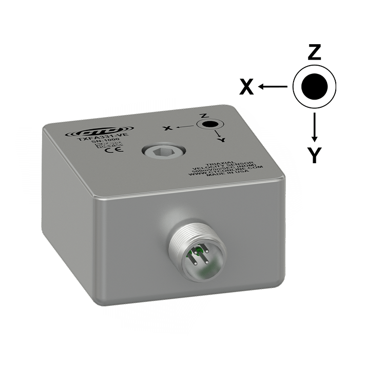 A standard size, stainless steel, side exit TXFA331-VE velocity triaxial sensor engraved with Z, X, and Y axes labels, CTC line logo, and other product information.